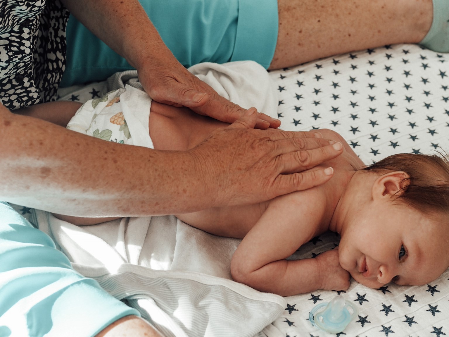 Kuvassa oletettavasti nainen istuu lattialla ja hieroo lattialla makaavaan vauvan selkää. Vauvalla on yllään vain vaippa. Lattialla lapsen vierellä on tutti.